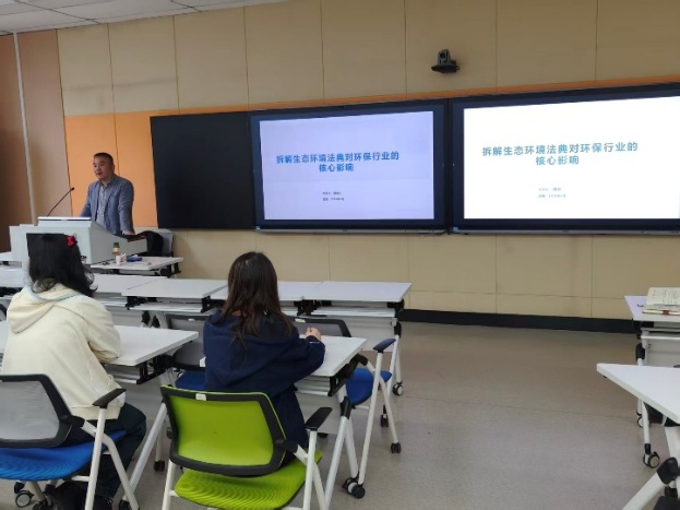 在L3203智慧教室成功举办“拆解生态环境法典对环保行业的核心影响”专题讲座 。本次讲座由学院应用化学专业教研室主任刘东邀请,特邀湖北跃华检测有限公司高级工程师黄彪主讲,吸引了60余名化学和环境类师生到场参与。